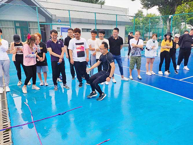 大家一排站好,從左到右,每人的右腿與另一人的左腿依次并齊,并用扁帶繩子系上,繩子綁的位置是腳踝以上部分。聽見哨聲即為游戲開始,從起點到終點,按用時由短到長,取前五名依次加分。