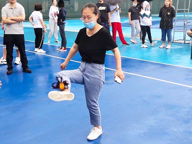 這是為女生們準備的個人賽,同理,男生也可以挑戰。參加者每人一次機會,踢毽子在不間斷、不落地的前提下,個數*多者勝利。并且冠*可以直接去選一個獎品拿走。