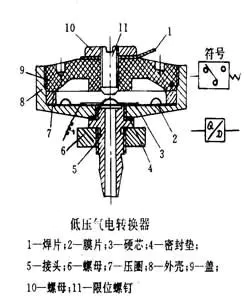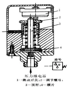 左圖所示為低壓氣電轉換器,硬芯3和焊片1是兩個觸點,無氣信號輸入時是斷開的。有一定壓力氣信號輸入時,膜片2向上運動帶動硬芯3和限位螺釘11接觸、與焊片1接通,發出電信號;氣信號消失時,膜片帶動硬芯復位,觸點斷開,電信號消失。調節螺釘11可以調整接受氣信號壓力的大小。右圖所示為壓力繼電器的工作原理固,輸入氣信號使膜片4受壓變形去推動*桿3啟動微動開關1,輸出電信號。輸入氣信號消失,膜片4復位,*桿在彈簧作用下下移,脫離微動開關。調節螺母2可以改變接受氣信號的壓力值。其結構簡單,制造容易,應用廣泛。